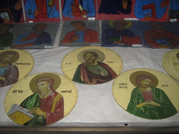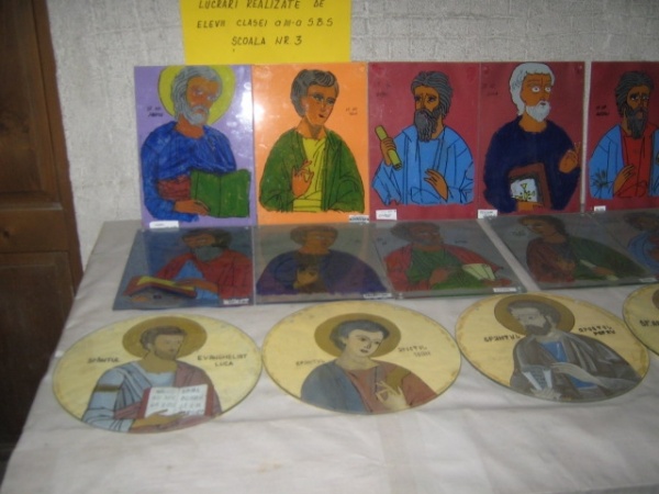 Picturile pe sticla rotundă, Pleiada Apostolilor, au fost realizate de către colectivul clasei a VIII- a C, sub îndrumarea prof. Erli Tunde, la invitaţia dirigintelui Dindelegan Carmen Maria. Colegii acestora, micii experţi, din clasa a III – a Step by Step, au reluat pictarea grupului apostolic, pe sticla de forma dreptunghiulară, cu o înveşmântare coloristică aparte şi impresionantă. Aceştia au fost îndrumaţi de învăţătoarele Micovschi Emilia şi Leşan Ilisi Ligia.