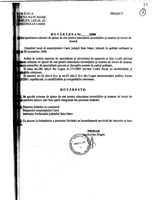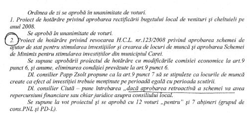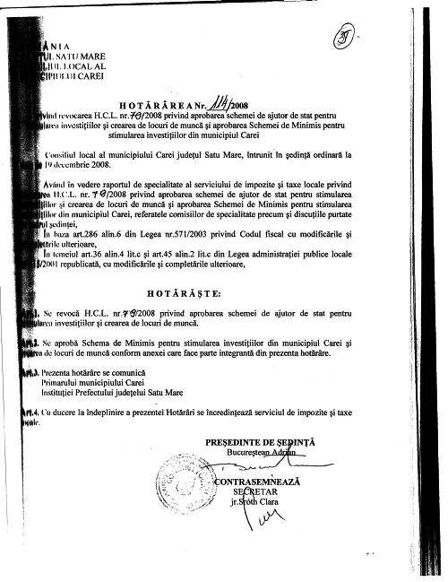 In urma răspunsului Consiliului concurenţei din decembrie 2008,pe masa de lucru a consilierilor se reia sub altă formă aprobarea schemei minimis,de ajutor de stat pentru stimularea investiţilor şi crearea de locuri de muncă,prin hotărârea 114/2008.
