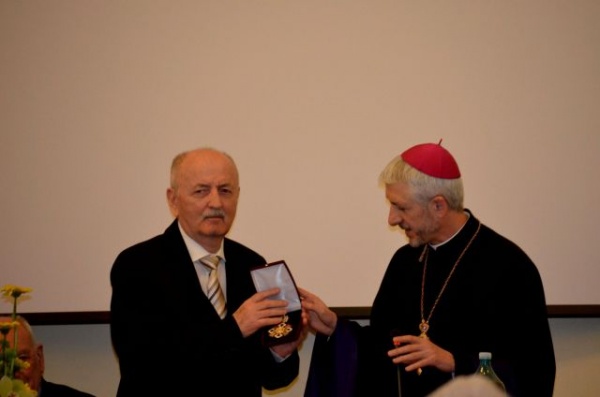 Preasfinția Sa episcopul Florentin, înmânând sărbătoritului Marele Ordin al Sfântului Iosif