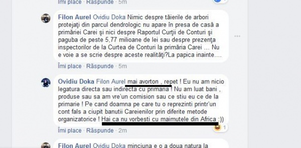 pacat ca in orasul nostru au ajuns astfel de persoane care folosesc injuraturile in locul dialogului. nici cei 7 ani de acasa nu ii au! sa faci pe cineva avorton si maimuta numai pentru ca nu este de acord cu tine??? careienii nu gusta astfel de oameni!
