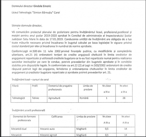 Așa arată planul de școlarizare pentru anul 2019-2020 de la Liceul Tehnologic ,,Simion Bărnuțiu,, Carei.
