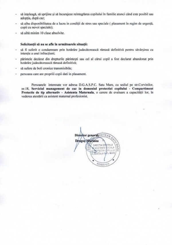 În cadrul proiectului TEAM-UP -Progres în calitatea îngrijirii alternative a copiilor, cod SMIS 127169, Direcția Generală de Asistență Socială și Protecția Copilului (DGASPC) Satu Mare, în calitate de partener, demarează o campanie de identificare și recrutare a persoanelor care sunt interesate de profesia de asistent maternal.