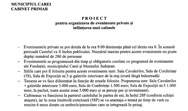 Majoritatea consilierilor municipali au votat ieri pentru aprobarea organizării de evenimente private în Castelul Karolyi. Singurul care a atras atenția asupra consecințelor ce derivă din închirierea pentru nunți și botezuri a recent renovatului monument istoric care este Castelul Karolyi a fost consilierul Ilie Ciută, cel care a inițiat pentru prima dată un proiect pentru reabilitarea edificiului.