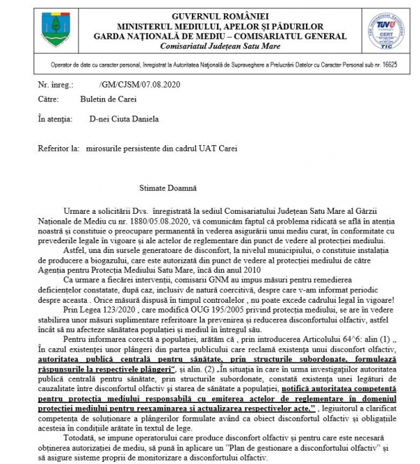 Garda Națională de Mediu- Comisariatul județean Satu Mare răspunde unei noi solicitări a redacției Buletin de Carei, singura redacție care s-a implicat de peste 1 an de zile ( 23 iunie 2019 prin adresa 1364) în problema mirosului pestilențial din oraș.