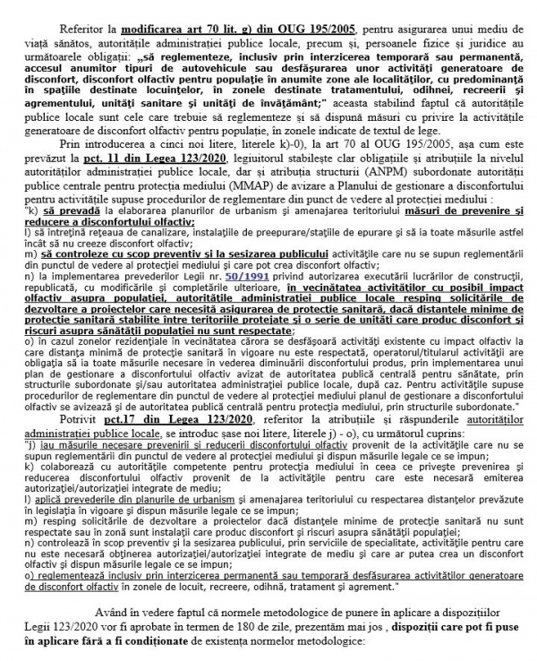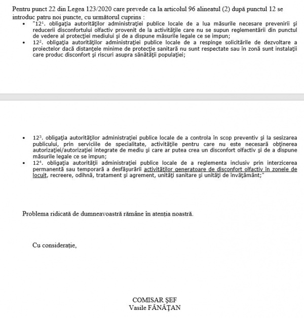 Garda Națională de Mediu- Comisariatul județean Satu Mare precizează faptul că prin  modificarea art 70 lit. g) din OUG 195/2005 autoritățile publice locale sunt cele care trebuie să reglementeze și să dispună măsuri cu privire la activitățile generatoare de disconfort olfactiv pentru populație, în zonele indicate de textul de lege.
