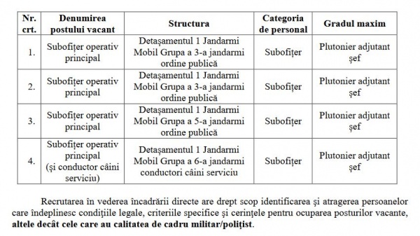 Inspectoratul de Jandarmi Județean Satu Mare organizează selecție pentru ocuparea următoarelor posturi vacante de subofițer în cadrul Detașamentului 1 Jandarmi Mobil, prin încadrare directă, pe o perioadă determinată, ce nu poate depăși 30 de zile de la încetarea stării de alertă, fără concurs: