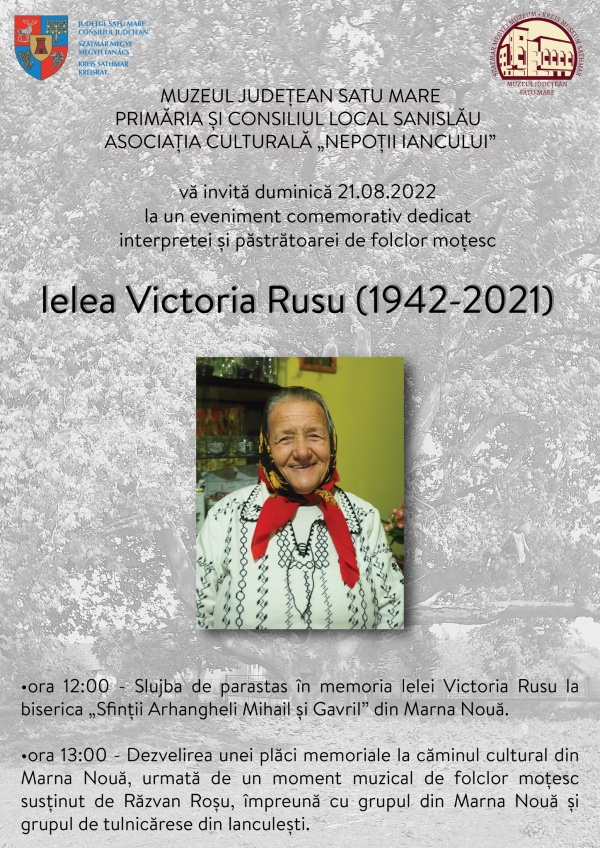 Duminică, 21.08.2022, va avea loc la Marna Nouă un eveniment comemorativ dedicat interpretei și păstrătoarei de folclor moțesc, lelea Victoria Rusu (1942-2021).