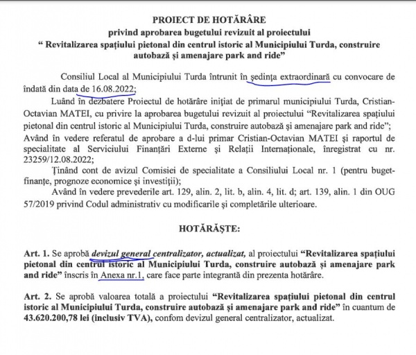 Primăria Turda a anunțat o ședință extraordinară a Consiliului Local pentru data de 16 august și supune atenției consilierilor un deviz general al proiectului despre care primarul spunea că prevede mutarea statuii lui Avram Iancu dar consilierii îl contrazic și spun că proiectele de hotărâre oferite lor nu aveau această prevedere.