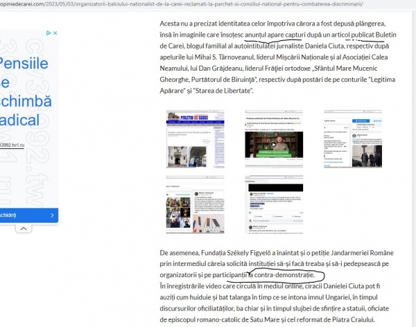 Cetățeanul din Harghita care este preocupat de cele petrecute la Carei este nimeni altul decât cel care a fost deranjat până la a deschide proces pentru că am cerut să fie amplasate ȘI plăci cu înscrisuri în limba română pe poarta de intrare la cimitirul unde sunt îngropați eroii români care au căzut în luptele de eliberare a Careiului de sub ocupația hortystă. Tot el a fost deranjat și de folosirea de citate din Mihai Eminescu și l-a acționat în judecată pe Mihai Târnoveanu de la Calea Neamului.