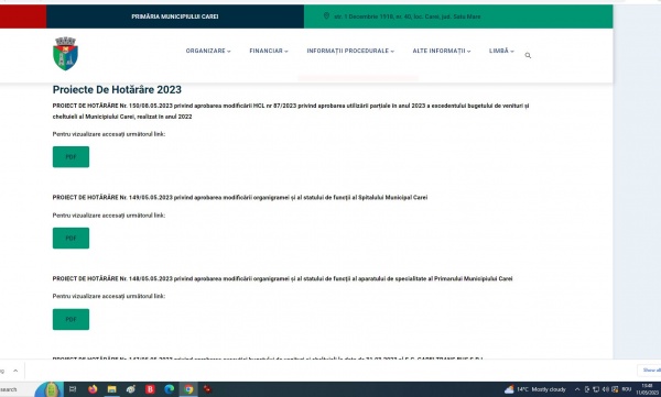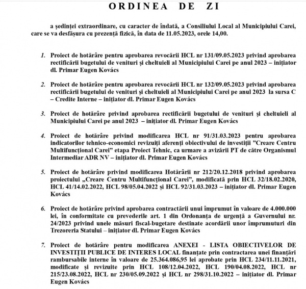 Ca de obicei, proiectele de hotărâre nu au fost făcute publice pe site-ul UAT Municipiul Carei înainte de începerea ședinței așa cum nu a fost postată nici Minuta de la ședința ordinară anterioară. Pentru administrația udemeristă Kovacs- Keizer nu e obligatorie respectarea legislației administrative.