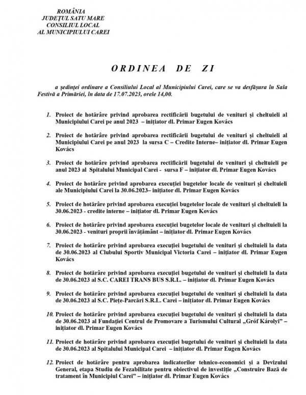 Aleșii locali sunt convocați în şedinţa ordinară a Consiliului Local al Municipiului Carei care se va desfășura în Sala Festivă a Primăriei, în data de 17.07.2023, orele 14,00.