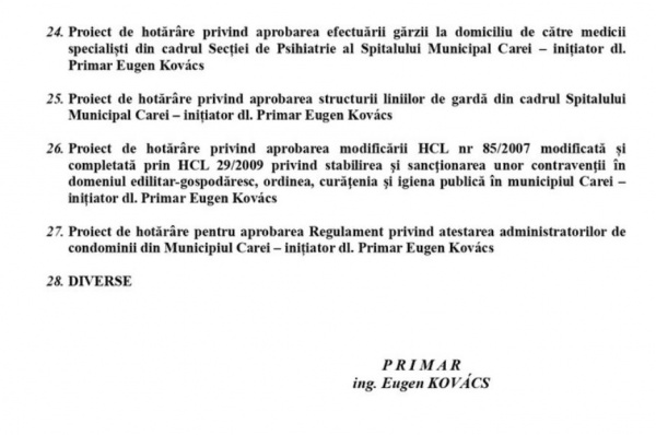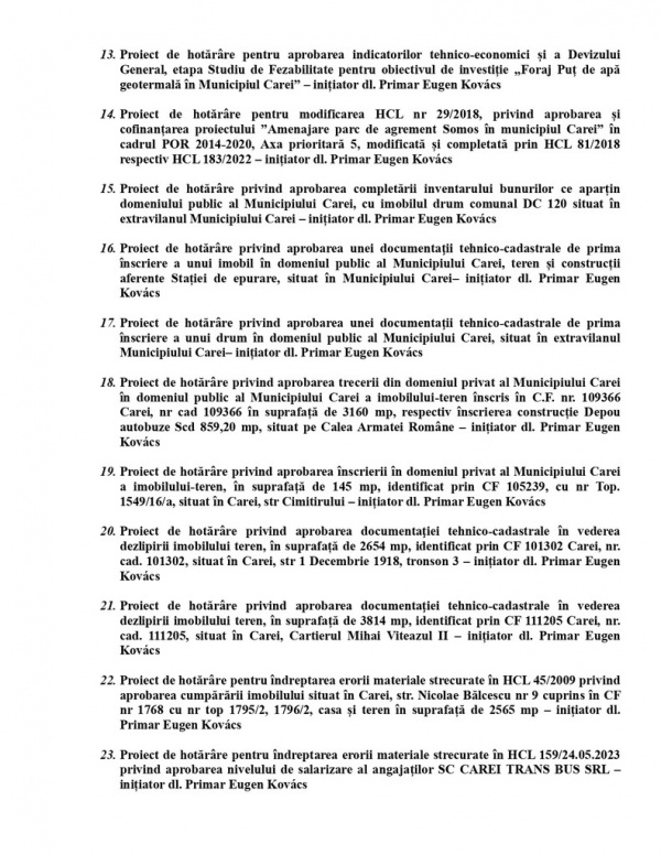 Consiliul Local Carei nu s-a întrunit în ședință ordinară în luna iunie. Toate proiectele de pe Ordinea de Zi a ședinței CL din 17 iulie 2023 sunt inițiate de primarul evazionist Kovacs care se folosește de mașina de vot reprezentată de consilieri pentru a-și face curat în acte și a reprezenta interesele de grup. Niciun consilier, de la niciun partid, nu a inițiat vreun proiect de hotărâre în ultimele luni.