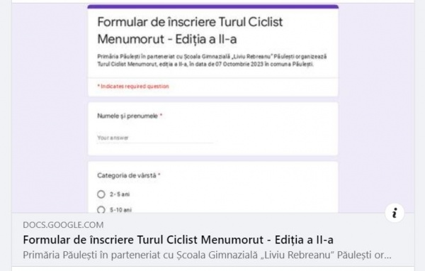 Primăria Păulești, în parteneriat cu Școala Gimnazială „Liviu Rebreanu” Păulești, organizează Ediția a II-a a Turului Ciclist Menumorut, în data de 07 Octombrie 2023.