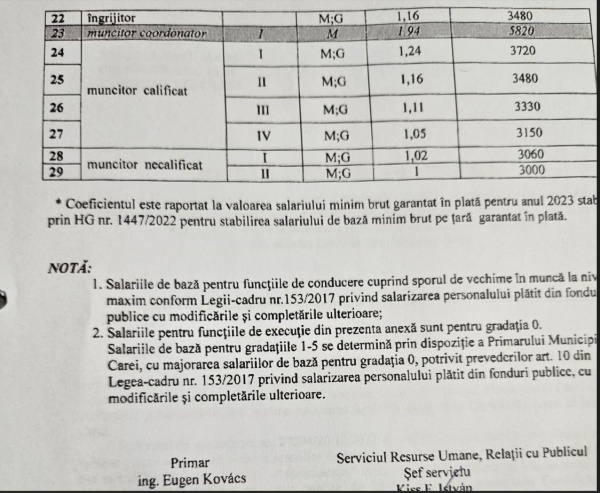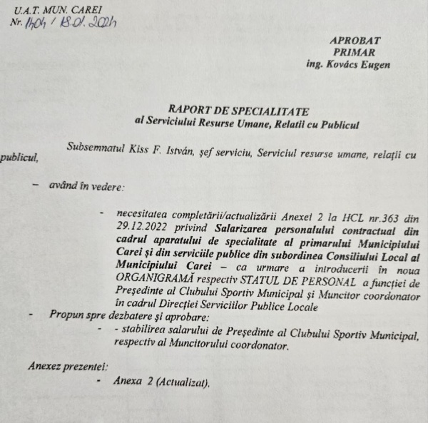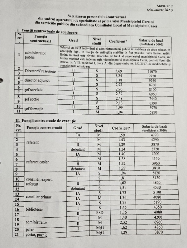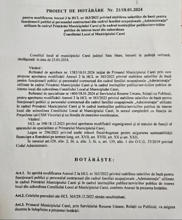 Marți, 23 ianuarie 2024, a avut loc ședința CL în care aleșii locali au votat în unanimitate salariile de bază pentru functionarii publici si personalul contractual din cadrul primăriei Carei. Generos din fire, că doar nu dă din buzunarul său, primarul a propus modificarea organigramei și înființarea de noi posturi: președinte la CSM Victoria și muncitor coordonator la DSPL. Se apropie alegerile….Încă nu a fost capabil să asigure o sonorizare în sala de ședințe și nici o sală adecvată dar împarte cu generozitate sporuri și favoruri pentru grupul de interese.