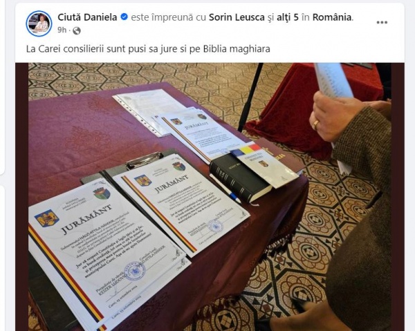 Familia udemeristă care a participat la Carei la investirea noului primar a fost deranjată de faptul că am observat mojiciile organizatorului care a acoperit cele două Biblii puse pe masa unde se depunea jurământul cu Constituția României.