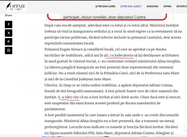 Așa de mare a fost deranjul pentru prezența deputatului Cozma la inaugurarea sediului Judecătoriei Carei renovat cu bani de la Banca Mondială nu de la Primăria Carei?