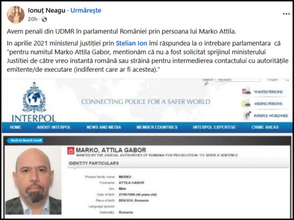 „Avem penali din UDMR în parlamentul României prin persoana lui Marko Attila. In aprilie 2021 ministerul justiției prin Stelian Ion îmi răspundea la o intrebare parlamentara că “pentru numitul Marko Attila Gabor, mentionăm că nu a fost solicitat sprijinul ministerului Justitiei de către vreo instantă românã sau străină pentru intermedierea contactului cu autoritățile emitente/de executare (indiferent care ar fi acestea).””, a scris fostul senator AUR Ionuț Neagu