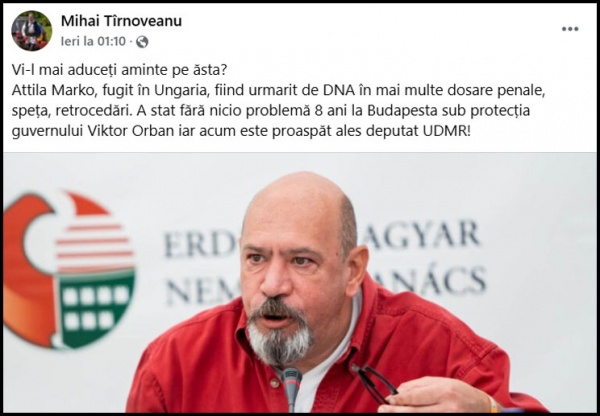 „Vi-l mai aduceți aminte pe ăsta?Attila Marko, fugit în Ungaria, fiind urmarit de DNA în mai multe dosare penale, speța, retrocedări. A stat fără nicio problemă 8 ani la Budapesta sub protecția guvernului Viktor Orban iar acum este proaspăt ales deputat UDMR!”, a scris pe facebook dr. Mihai Tîrnoveanu
