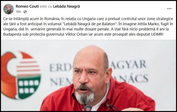 „Ce se întâmplă acum în România, în relația cu Ungaria care a preluat controlul unor zone strategice ale țării a fost anticipat în volumul „Lebădă Neagră de pe Balaton”. În imagine Attila Marko, fugit în Ungaria, dat în urmărire generală în mai multe dosare penale. A stat fără nicio problemă 8 ani la Budapesta sub protecția guvernului Viktor Orban iar acum este proaspăt ales deputat UDMR!”, a scris jurnalistul Romeo Couti pe facebook