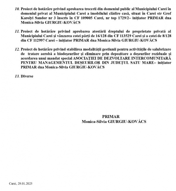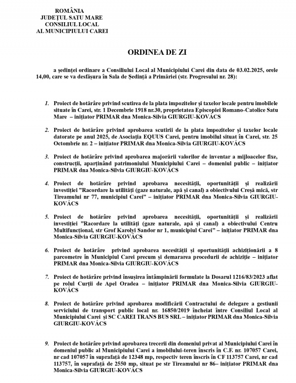 Primăria Carei anunță o şedinţă publică ordinară a Consiliului Local al Municipiului Carei pentru data de 03.02.2025, orele 14,00, care se va desfășura în Sala de Ședință a Primăriei (str. Progresului nr. 28).