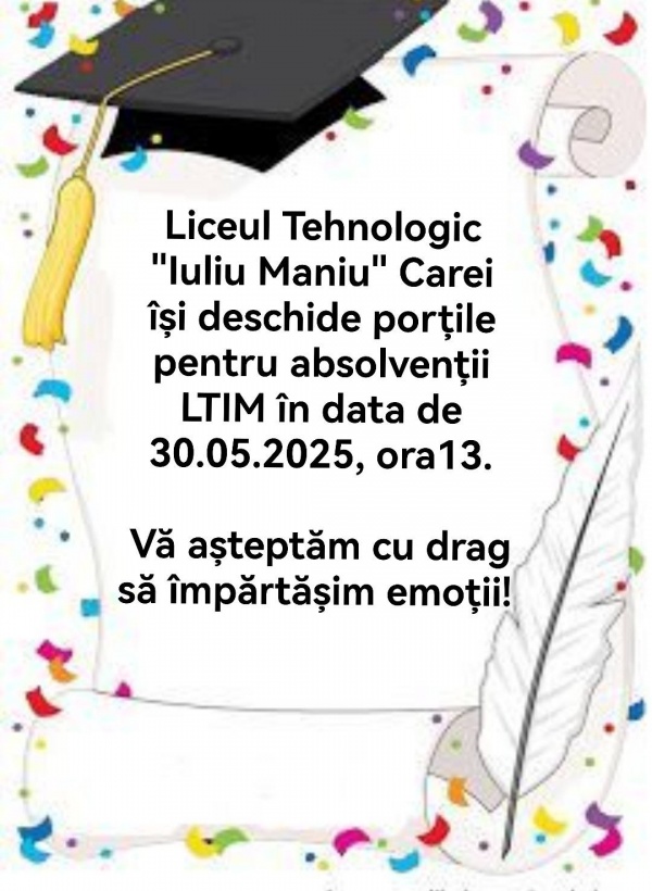 Liceul Tehnologic Iuliu Maniu organizează în data de 30 mai 2025 o întâlnire comună a tuturor absolvenților. De la ora 13,00 sunt așteptați toți cei care au urmat cursurile acestui liceu care a avut mai multe denumiri de-a lungul timpului.