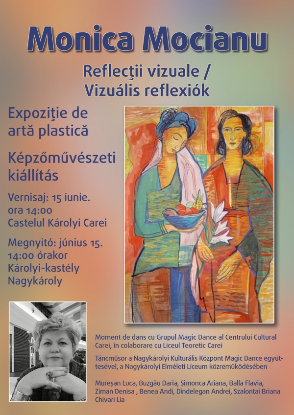 Duminică, 15 iunie, 2025, de la ora 14:00, în Sala Cavalerilor a Castelului Károlyi va avea loc vernisajul expoziției de pictură „Reflecții vizuale” a artistei Monica Mocianu.