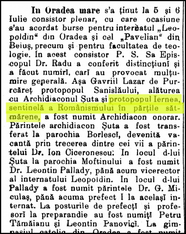 Pe 20 august 1907 părintele Lazăr Iernea a fost amendat cu 100 coroane pentru că a îndemnat sătenii din Ciumești sã țină la limba lor românească.