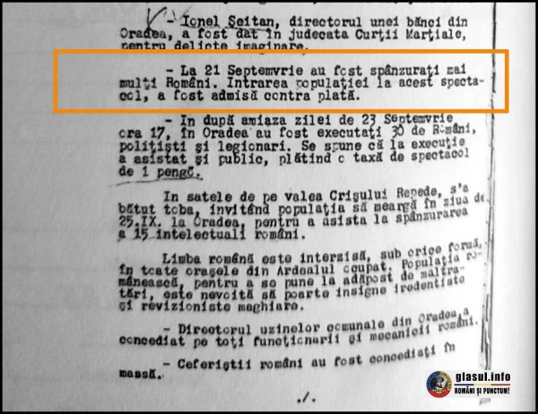 În după amiaza zilei de 23 septembrie 1940, ora 17, în Oradea au fost executați 30 de români, printre care și polițiști. La execuție a asistat și public, plătind o taxă de spectacol de 1 pengo.”