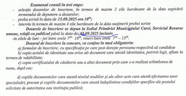 Doar astăzi vă mai puteți depune dosarul pentru înscriere la concursul pentru 4 locuri de muncă în cadrul Primăriei Carei. Anunțul a fost redactat la data de 21 august 2025, încărcat pe site la data de 22 august 2025 dar cu programare pentru vizibilitate doar de la data de 2 septembrie 2025.
