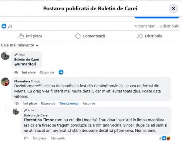 La manifestarea dedicată Zilei Sportului careian a fost prezentă o echipă de handbal din Cămin scrie doamna inspector Florentina Timoc doar că limba română le era străină pe materialele promoționale. Ce faceți doamna inspector liberal? Promovați abdicarea de la limba română la manifestările sportive pe care le organizați? E frumos ce faceți?