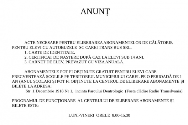 Un Anunț privind eliberarea abonamentelor gratuite pentru elevii care frecventează școlile din Carei a fost postat pe pagina Primăriei Carei. Nu se specifică deloc situația elevilor din satul Ianculești care aparține de UAT Carei. Nici situația transportului în comun către satul Ianculești ai cărui locuitori plătesc taxe și impozite către Primăria Carei.