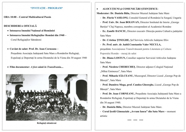 Sub titlul „COMEMORAREA DICTATULUI DE LA VIENA – 85 de ani. 1940 – 2025. SURSE DOCUMENTARE, MĂRTURII, REPERCUSIUNI” se va organiza o conferință științifică la inițiativa Asociației Județene Satu Mare a Românilor Refugiați și Expulzați în urma Dictatului de la Viena din 30 august 1940 în colaborare cu Muzeul Județean Satu Mare, Academia Română – Institutul de Istorie ”George Barițiu”, prin aportul de excepție al directorului său, domnul Academician Prof. Univ. Dr. Ioan Bolovan, în parteneriat cu ASTRA, președinte Pr. Prof. Univ. Dr. habil Constantin Valer Necula.