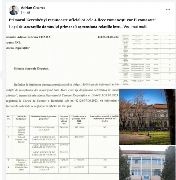Primarul Kereskenyi Gabor recunoaște oficial că cele 4 licee românești din Satu Mare vor fi comasate și aruncă responsabilitatea în sarcina altora – ministrul educației, inspectoratul școlar județean și alți dușmani închipuiți! notează deputatul Adrian Cozma pe pagina sa. După