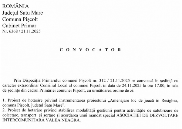 Luni, 24 noiembrie 2025, de la ora 17,00 va avea loc o ședință extraordinară a Consiliului Local Pișcolt la sediul primăriei din comună. Pe Ordinea de zi figurează două proiecte inițiate de primarul Cosmin Varga. Ședința