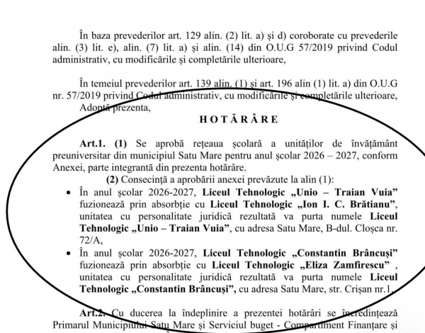 Cu o rapiditate demnă de cauze mai bune, pe ordinea de zi a ședinței de joi a Consiliului Local a apărut un proiect de hotărâre prin care s-ar consfinți, practic, decizia majorității politice UDMR+PSD din Consiliul de Administrație al Inspectoratului Școlar Județean privind comasarea celor patru licee tehnologice din Satu Mare.