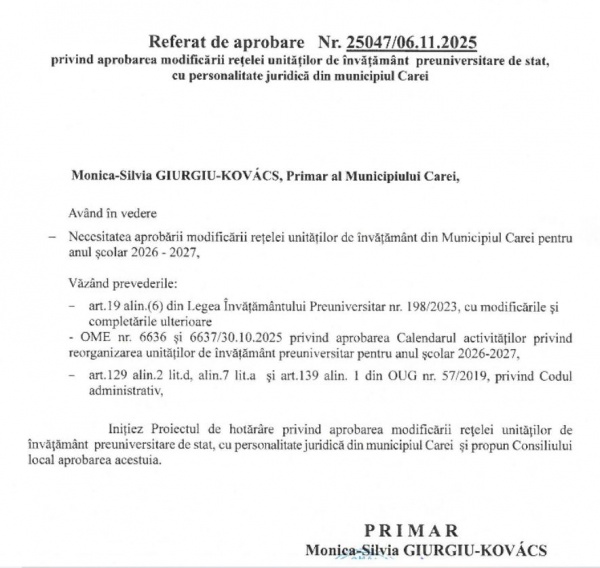 La ședința CL Carei din data de 15 decembrie 2025 s-a supus la vot aprobarea noii rețele școlare din Carei. Referatul de aprobare al proiectului data din 6 decembrie 2025 dar subiectul a fost unul tabu din moment ce nu a avut nimeni curaj să abordeze problema.