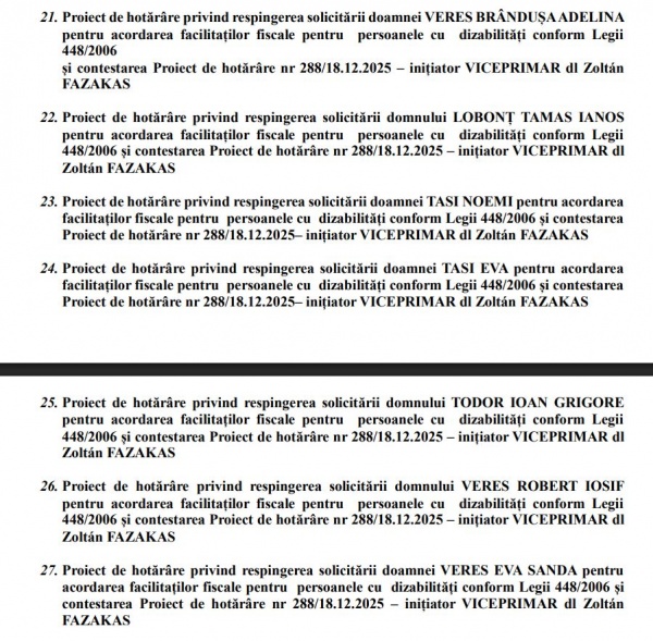 Marți, 10 februarie 2026, de la ora 14,00, consilierii careieni sunt convocați într-o ședință ordinară pentru a vota fel și fel de proiecte de hotărâre printre care și respingerea acordării de facilități fiscale pentru persoanele cu handicap. După ce în data de 19 decembrie 2025 toți consilierii locali au votat pentru mărirea de taxe și impozite locale acum vor să respingă orice solicitare din partea persoanelor cu handicap pentru facilități fiscale.