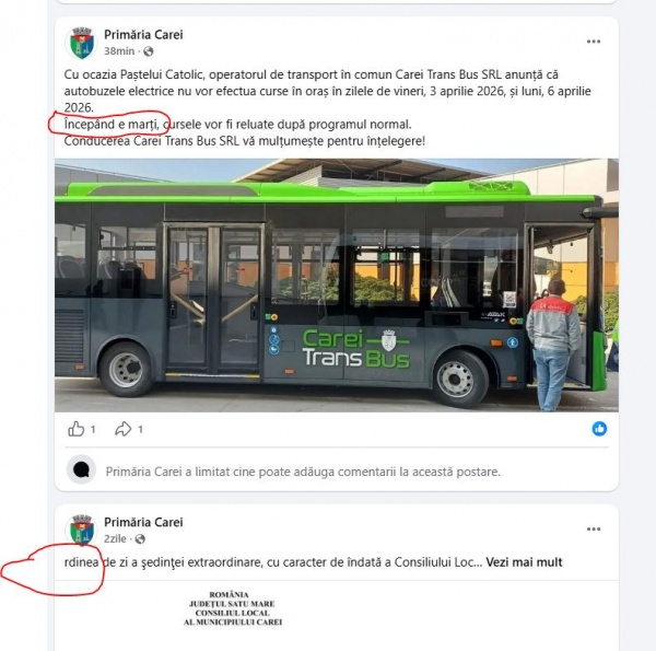 Fomiștii de litere de la Primăria Carei anunță suspendarea transportului în comun pentru zilele de 3 și 6 aprilie 2026, adică vineri și luni, zile de sărbătoare ale Paștelui Catolic.