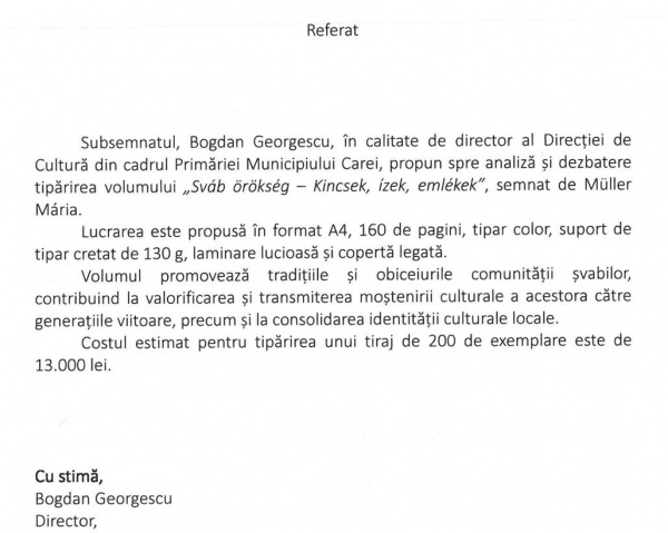 Ieri, 29 aprilie 2026, a avut loc ședința ordinară a Consiliului Local Carei. Unul din proiectele inițiate de primarul UDMR a fost de finanțare integrală a apariției volumului editat de Muller Maria, ,,Svab orokseg – Kincsek, izek, emlekek,,.