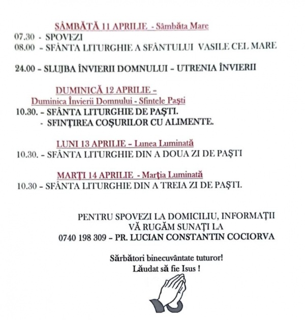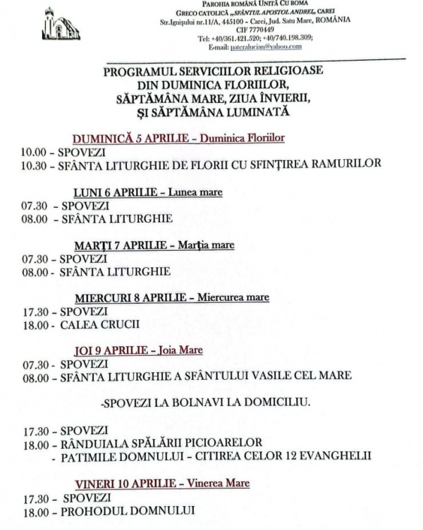 Programul slujbelor religioase de la Catedrala Ortodoxă,, Sf. Dimitrie Izvoratorul de Mir’’ și de Biserica greco-catolică Sfântul Andrei.