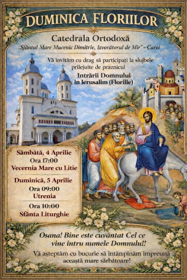 Creştinii români marchează duminică, 5 aprilie 2026, Floriile iar în data de 12 aprilie Învierea Domnului. De-a lungul săptămânii viitoare au loc spovedanii iar începând de Joi, numita Joia Mare când Mântuitorul Iisus Hristos a fost prins spre a fi judecat şi răstignit, încep slujbele specifice Paştelui.