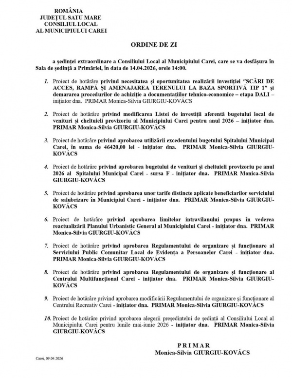 Primăria Carei anunță pentru data de 14 aprilie 2026, a treia zi de Paște, o ședință de îndată de la ora 14,00. Ca de obicei, doar primarul inițiază proiectele de hotărâre. Consilierii locali sunt acolo doar de decor și pentru a vota tot ce propune primarul.